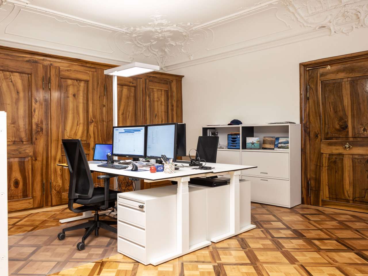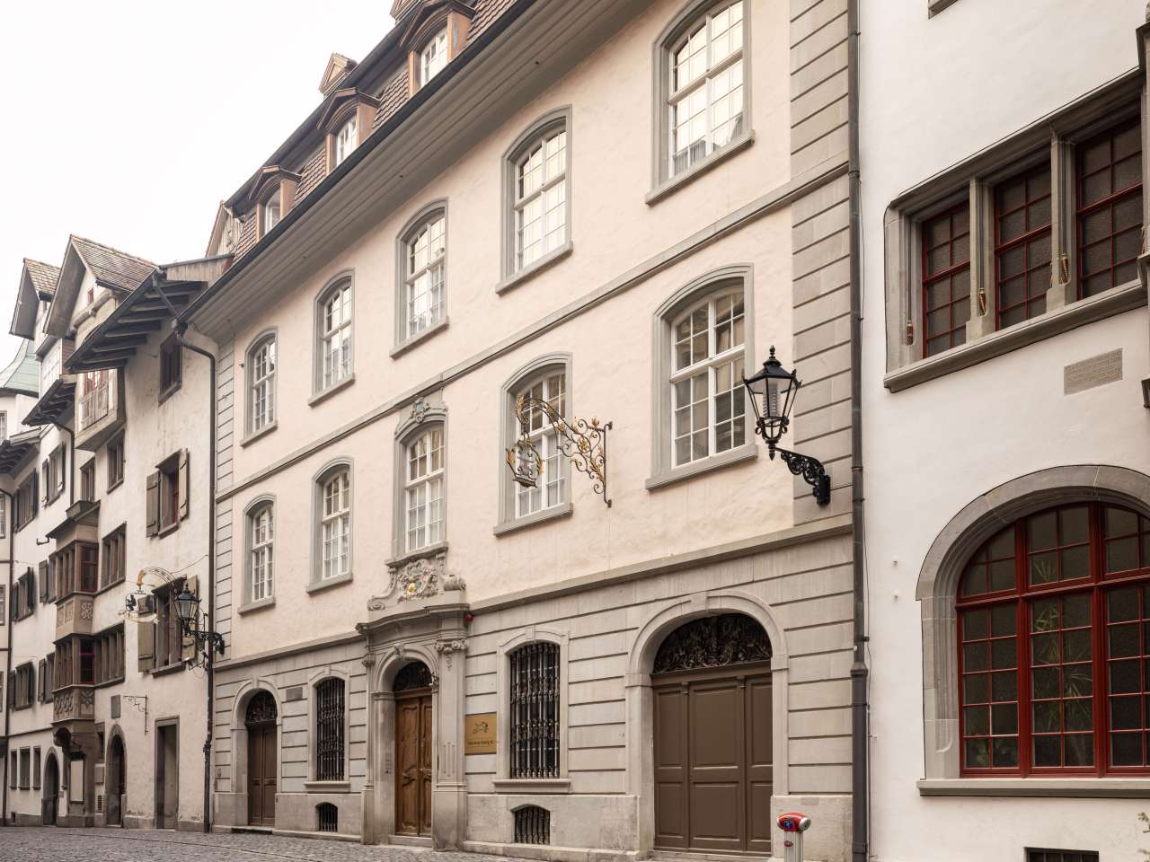 In the heart of St.Gallen's city center: the Debrunner Koenig Group's headquarters have been located at Hinterlauben 8 for over 50 years. It's worth taking a look inside. Murals, old wooden walls, sandstone stairs and beautiful wooden windows. The fact that these contemporary witnesses are so well preserved is thanks to the Debrunner Koenig Group, which, with the involvement of experts, is specifically committed to preserving the property. In this way, the history of the city of St.Gallen continues to live on and is being brought into the modern age.