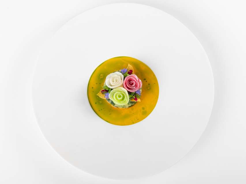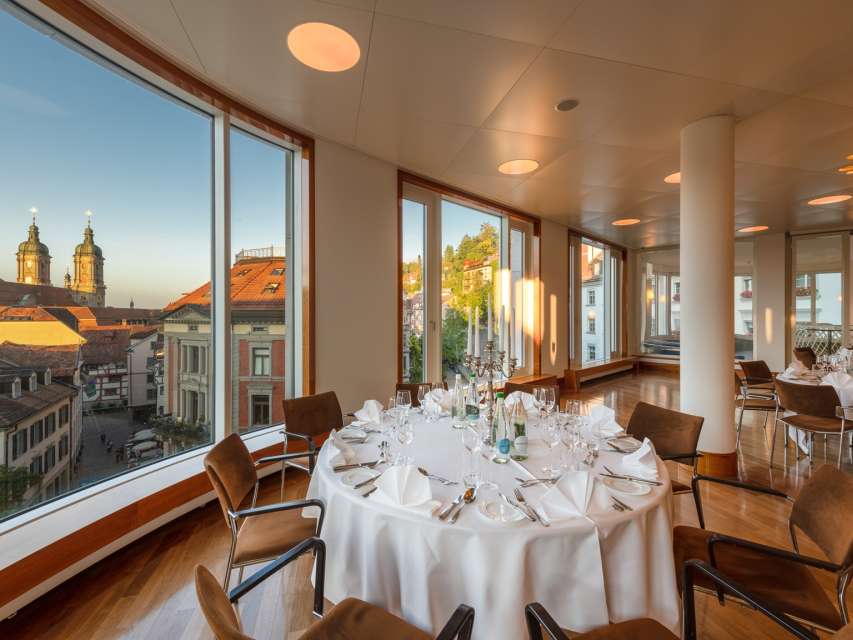 Above the rooftops of St. Gallen, on the 5th floor with a view over the city, chefs Sebastian Zier and Richard Schmidtkonz await their guests at Einstein Gourmet, which has been awarded 18 GaultMillau points and two Michelin stars. A variety of flavors and first-class products are prepared with great attention to detail. The French-influenced and cosmopolitan cooking style is rounded off by restaurant managers Loris Lenzo and Daniel Bölle with exquisite wines from the restaurant's own wine cellar. Exclusive rarities from Bordeaux and Burgundy, fine champagnes and a remarkable number of world-class Swiss wines are stored in the white Bordeaux limestone vaults.