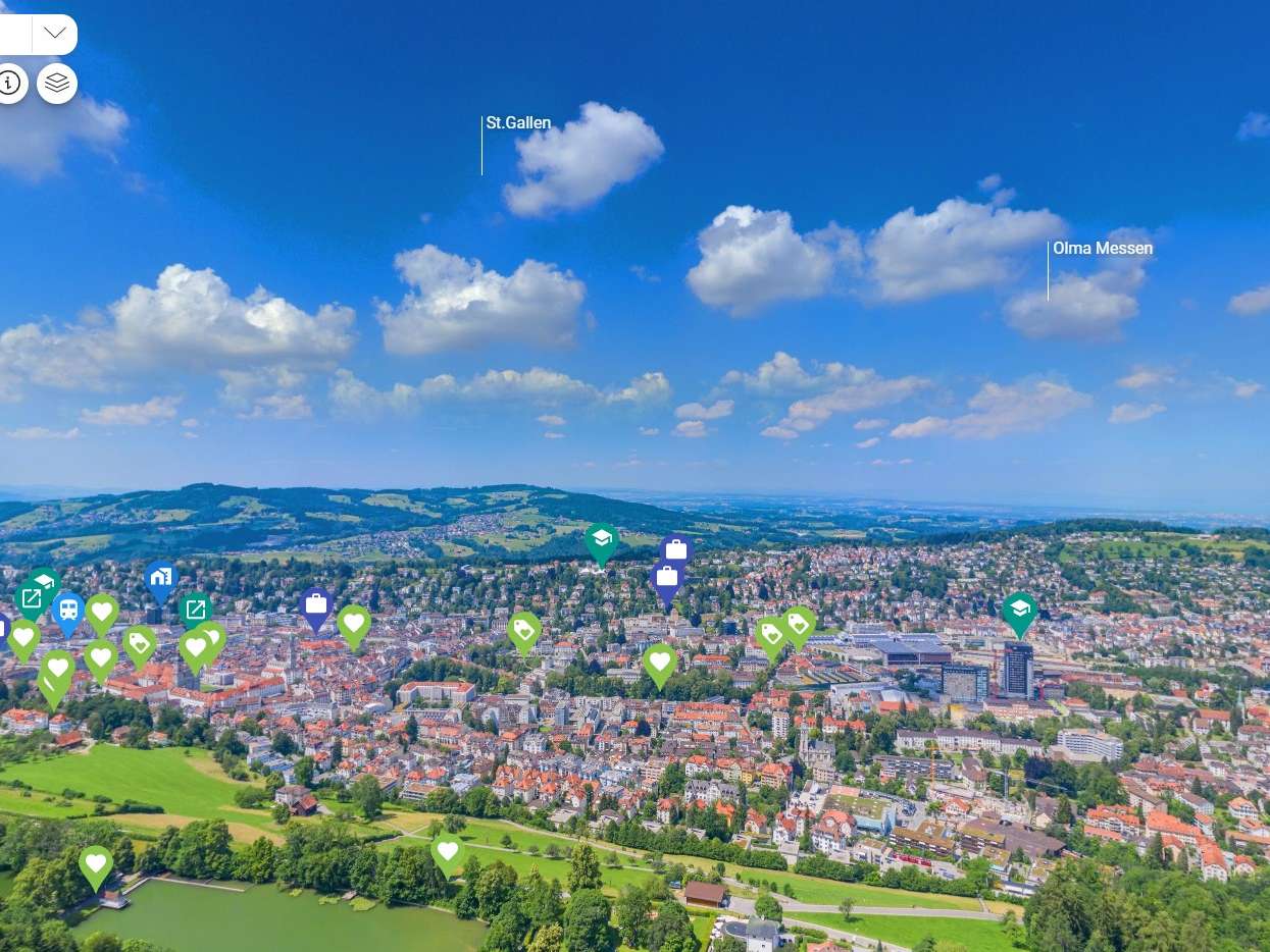 Experience the city of St.Gallen with virtual reality - that's possible with "east-site". On the website east-site.stadt.sg.ch you can get to know the city of St.Gallen from a new perspective via cell phone, tablet or PC. Discover your favorite places in the city, real estate, companies and much more.