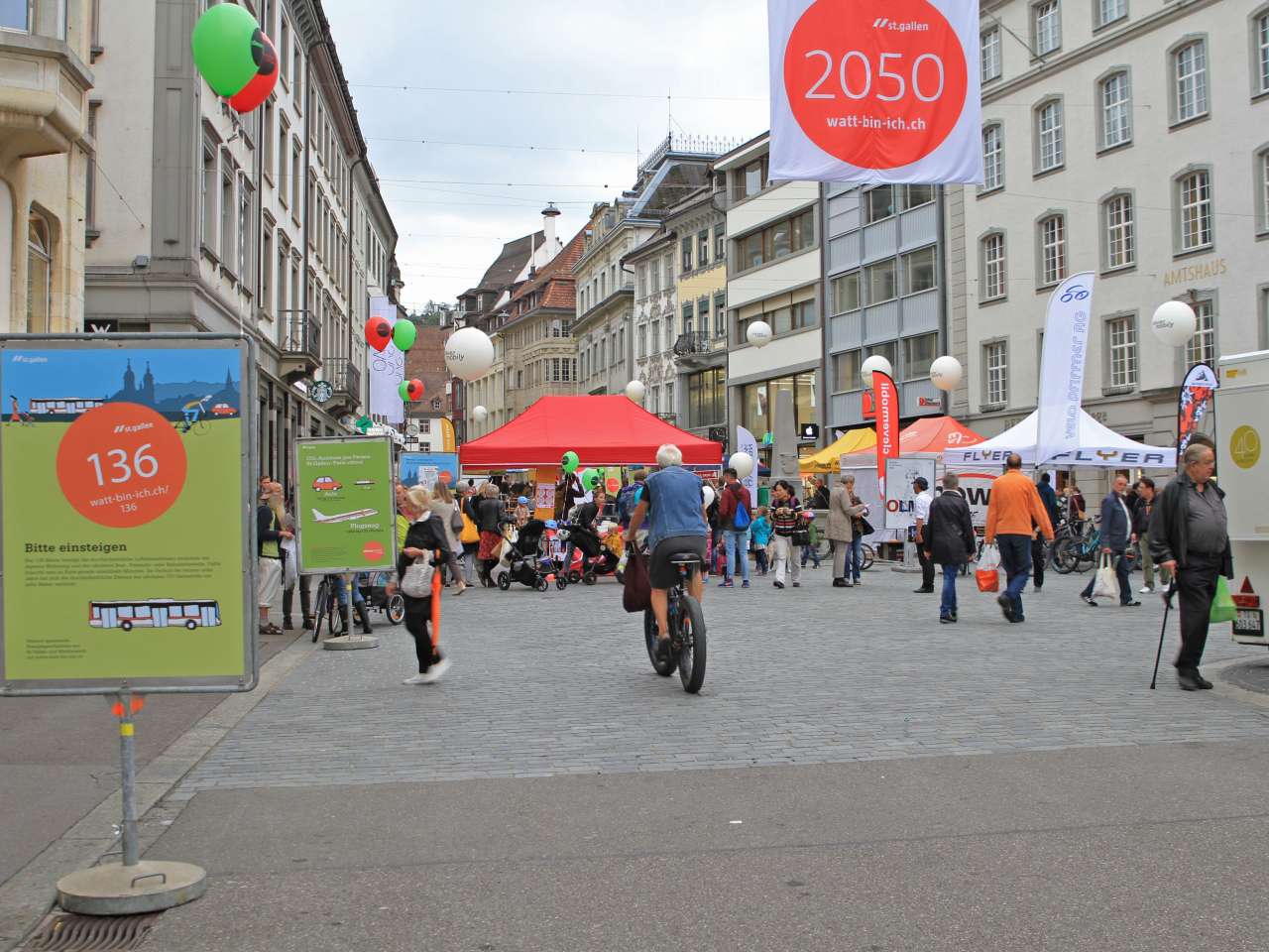 The St.Gallen mobility market provides interactive information about the various forms of mobility and invites you to discover them anew. Those who cleverly combine the various means of transport can reach their destination comfortably, quickly and in an environmentally friendly way. Around 20 organizations present their offerings on the topics of cycling, road safety, electromobility, walking and public transport. The market offers a wide range of information: Tips on hiking and cycling excursions in the region, interesting facts about the public transport network in the city and region, new e-bike and e-scooter models, exciting facts about running bikes for adults or e-charging stations and much more.
