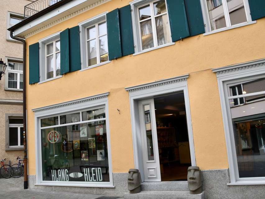 Freshly renovated at Kugelgasse 5 / Brühlgasse 18 stands a neat, yellow building with green shutters. The words "Klang und Kleid" are emblazoned in the shop window and old records can be seen. Whether young punks or older ladies - everyone is welcome at Klang und Kleid.